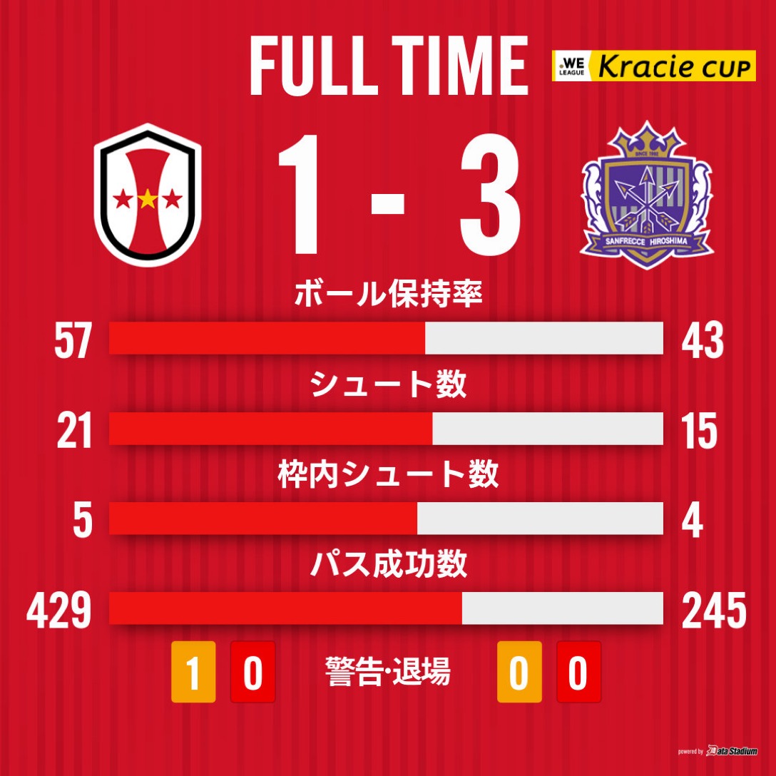 今シーズンが始まるときに三冠という目標を掲げた中で、WEリーグ クラシエカップの初戦を落としてしまったことはとても残念に思っています。相手のストロングポイントは分かっていましたが、そのストロングを出させてしまい、失点してしまいました。後半の立ち上がりにも失点し、チームとしてそのビハインドを乗り切れずに終わってしまいました。それは私自身も反省しています。ただ、今日はなかなか点を取れませんでしたが、ボールの動かし方に関しては自分たちがやりたいようなプレーを出せていたと思いますし、最後に1点を返したことは今後へ向けて大きなゴールになったと思います。この1点がグループステージを突破するうえで次に繋がる得点になるように、またみんなで頑張っていきたいと思っています。