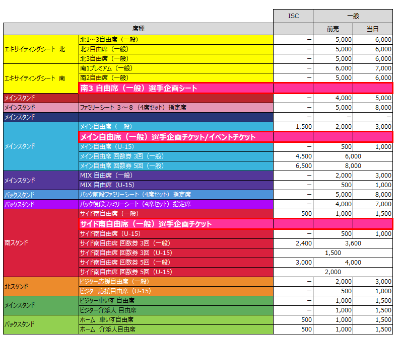 ※ピンク色の席種は、最終節限定の特別シートとなります。詳細、価格は別途ご案内いたします。