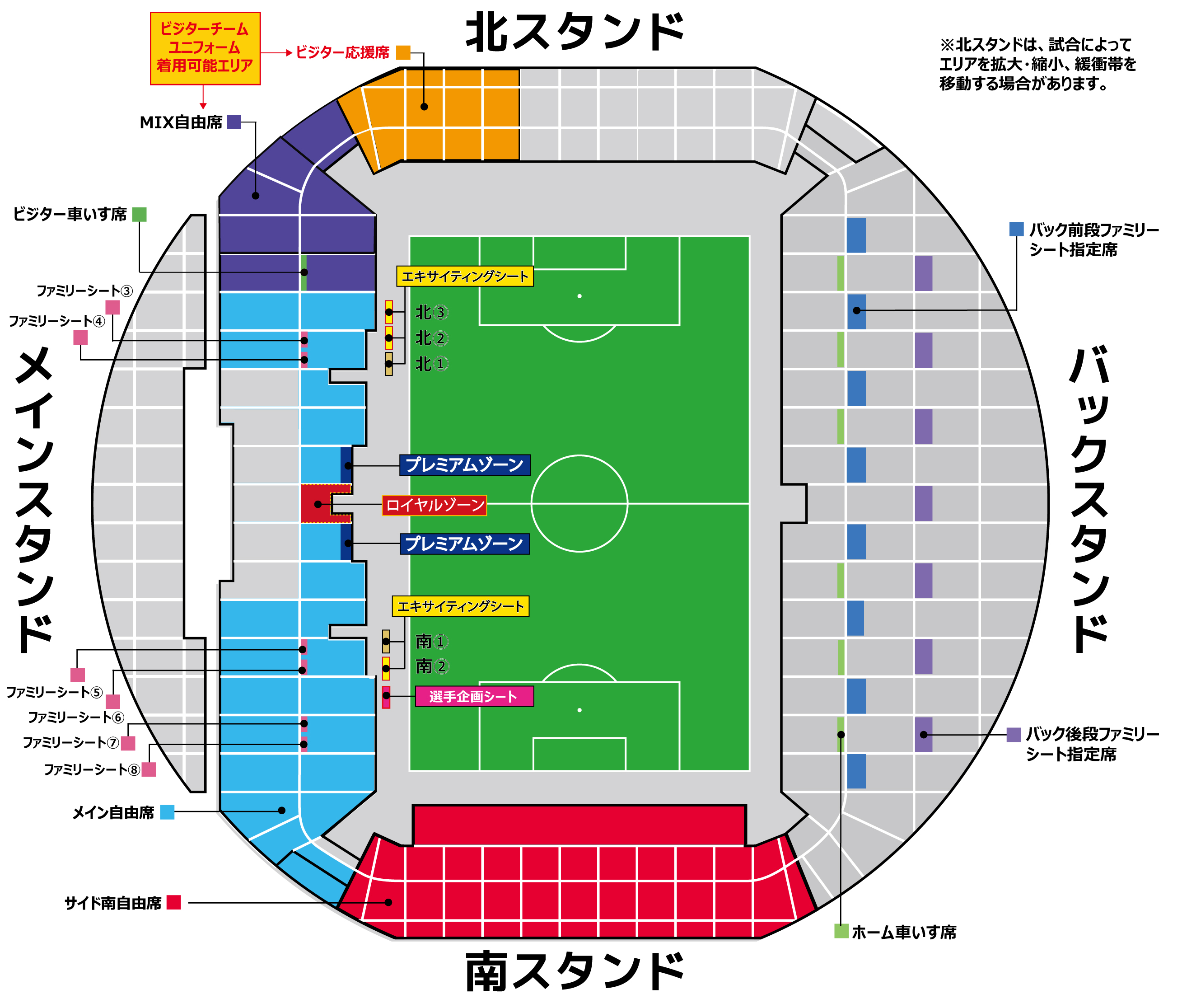 ※メイン北側の「MIX自由席」は、ホーム、ビジターを限定しないエリアです。指定エリア以外でのビジターチームユニフォーム・応援グッズを着用してのご観戦、およびビジターチームの応援は禁止となります。また、立ち上がっての応援を希望される方はオレンジ色のビジター応援席をご購入ください。
