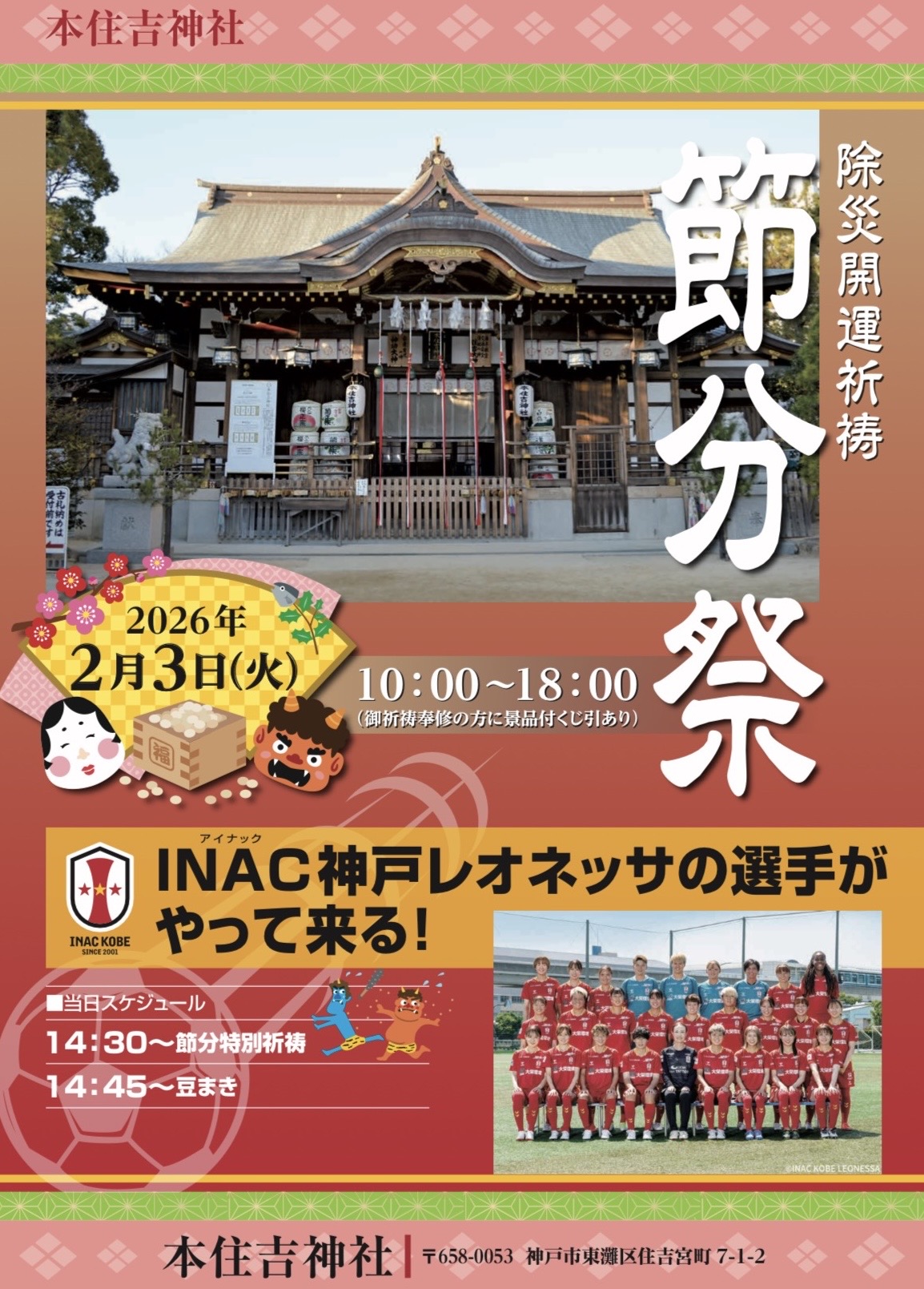 2月3日(火)に本住吉神社で行われる「節分祭」に選手とらいかちゃんが参加することが決まりましたので、お知らせいたします。どなたでも見学が可能となっております。